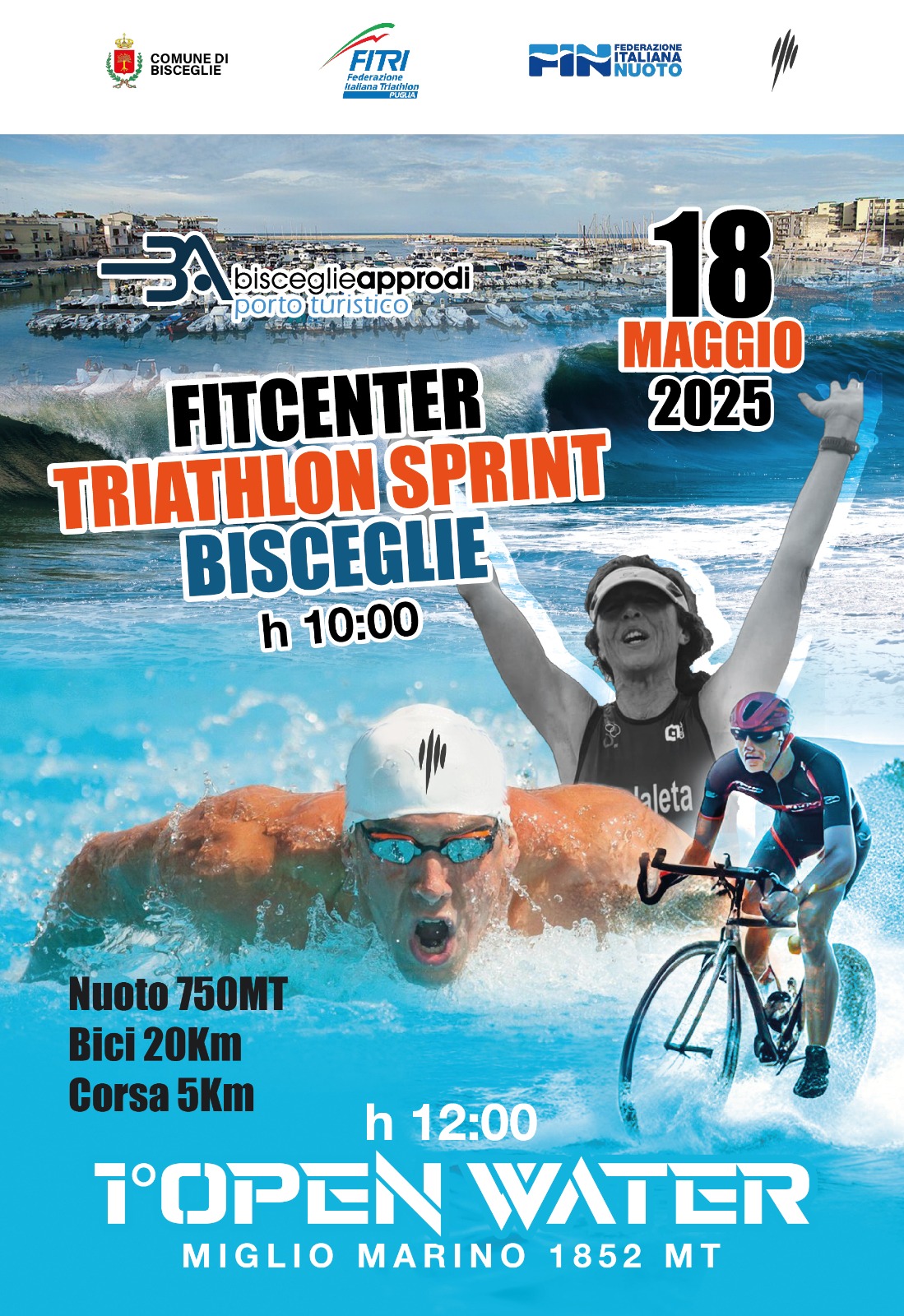 Il Circolo della Vela di Bisceglie partecipa attivamente all’organizzazione della prima gara di TRIATHLON che si terrà il 18 Maggio 2025. Gli atleti gareggeranno per aggiudicarsi le prime posizioni, rispettivamente nelle gare di 750 mt di nuoto, 20 Km in bici e 5 Km di corsa, partendo alle ore 12.00 dall’area di Nord Ovest del marina resort BISCEGLIE APPRODI SPA presso il porto di Bisceglie. La manifestazione è patrocinata dal Comune di Bisceglie e si svolgerà secondo le regole della Federazione Italiana Triathlon e Federazione Italiana Nuoto.