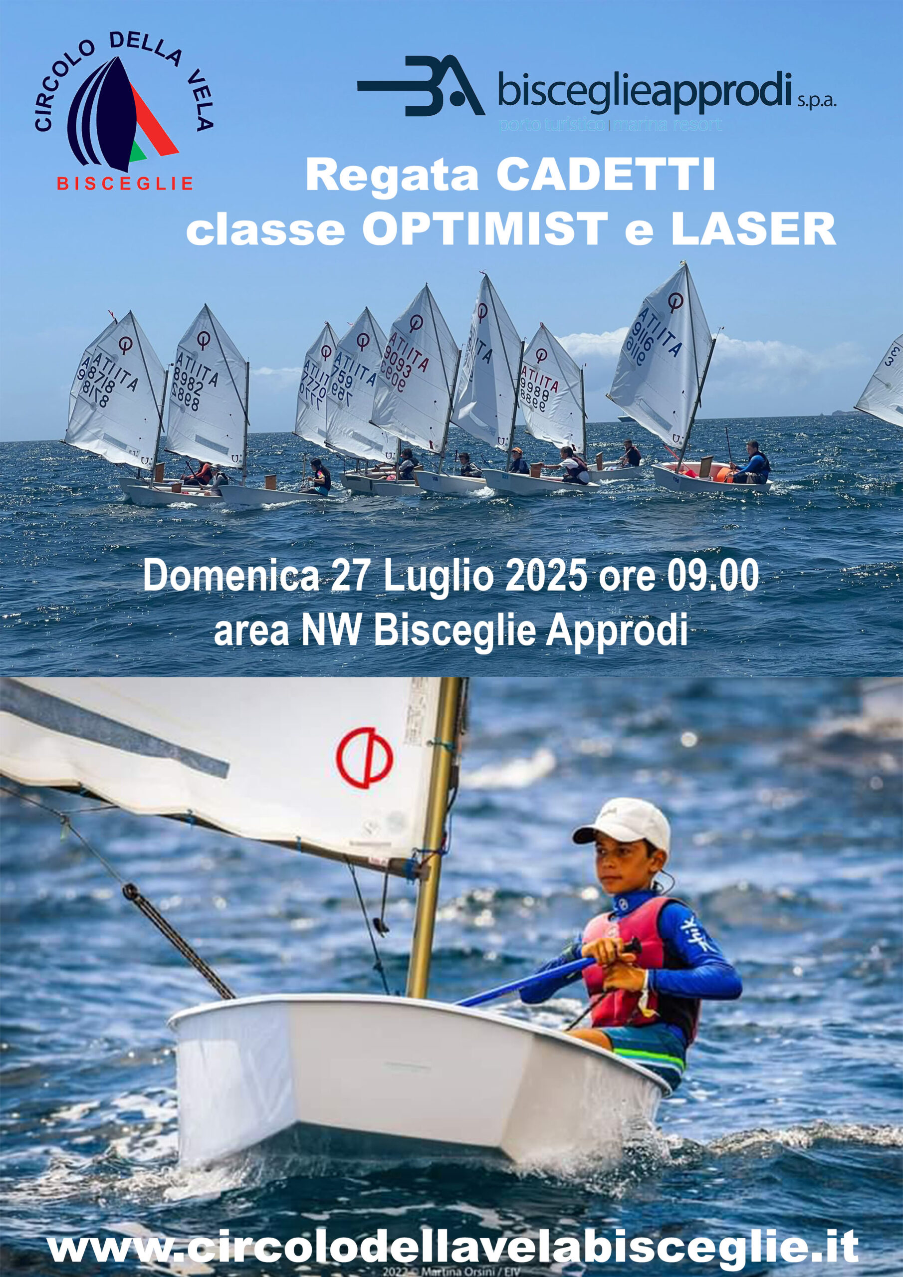 Domenica 27 Luglio 2025 a partire dalle ore 09.00, presso l’area di nord ovest del marina resort Bisceglie Approdi, il CIRCOLO DELLA VELA di Bisceglie organizza la “REGATA CADETTI per gli allievi della scuola vela delle classi OPTIMIST e LASER”. Le gare verranno gestite dai nostri istruttori FIV e si svolgeranno in raggruppamenti per livelli di esperienza degli allievi. Al termine: cerimonia di premiazione con medaglie color oro/argento/bronzo. Accesso libero.