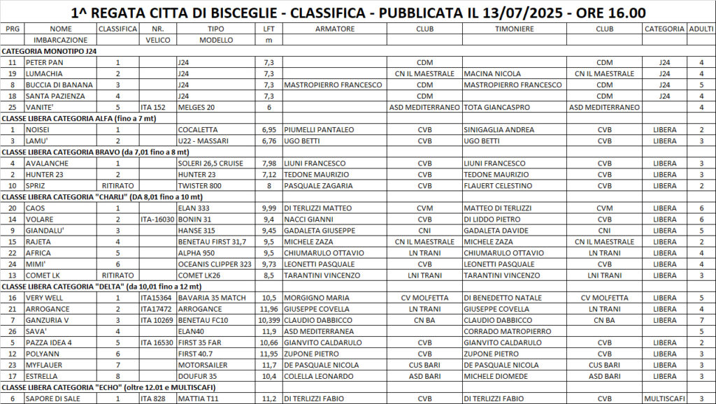 La regata è programmata nel calendario FIV (Federazione Italiana Vela) per Domenica 13 Luglio 2025.