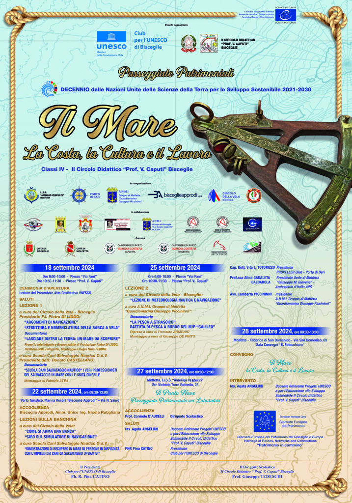 Anche quest’anno il Circolo della Vela di Bisceglie partecipa attivamente all’iniziativa organizzata dal Club per l’UNESCO di Bisceglie, impegnato a sostenere incontri di Educazione, Scienza, Cultura e Comunicazione sul Patrimonio, finalizzati a stimolare il pensiero critico e indurre il senso di collettività e responsabilità nei confronti del mondo in cui viviamo.