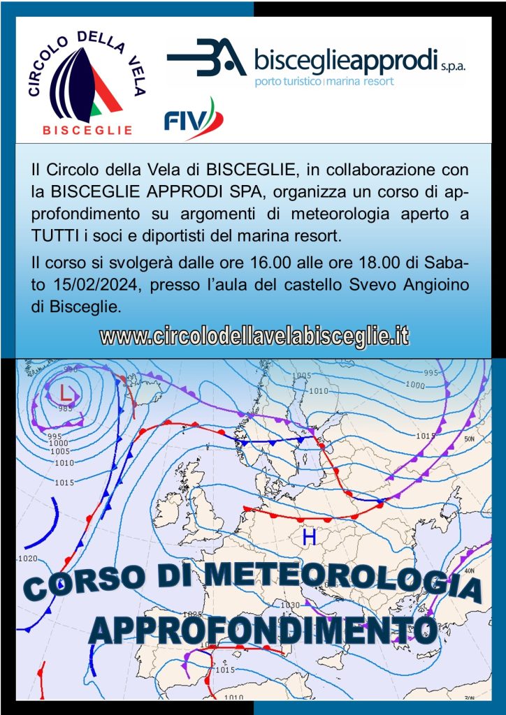 Grande interesse e partecipazione per il “corso di meteorologia” organizzato dal Circolo della Vela di Bisceglie, in collaborazione con la Bisceglie Approdi spa, aperto gratuitamente a soci e diportisti del marina resort. Il corso si è svolto presso il castello Svevo Angioino di Bisceglie, l’8 e 15 Febbraio 2025; tenuto dai nostri tutor: Di Liddo Pietro e Tedone Maurizio, che hanno illustrato i concetti principali della meteorologia, finalizzati alla pianificazione di crociere e regate, per una maggiore sicurezza in mare. Il Circolo della Vela di Bisceglie intende continuare con detta attività didattica, programmando, per il 2025, ulteriori corsi di formazione su argomenti quali: apparati VHF, sicurezza in mare e primo soccorso, confermandosi come riferimento principale per la divulgazione della cultura marinaresca, sicurezza in mare e rispetto per l’ambiente.